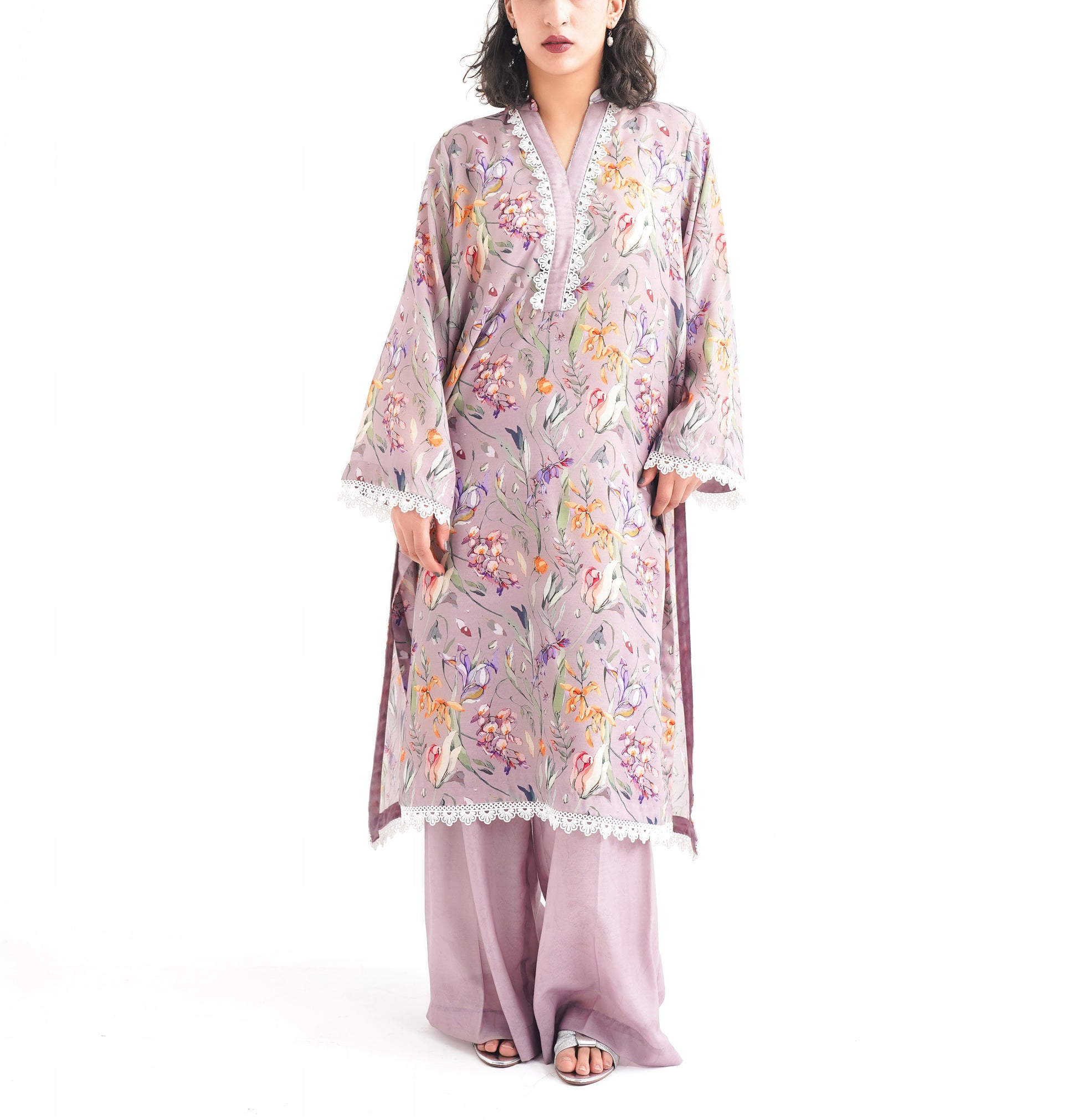Draped in a soft mauve canvas, this print blossoms with painterly florals in whispers of ivory, peach, and lilac.