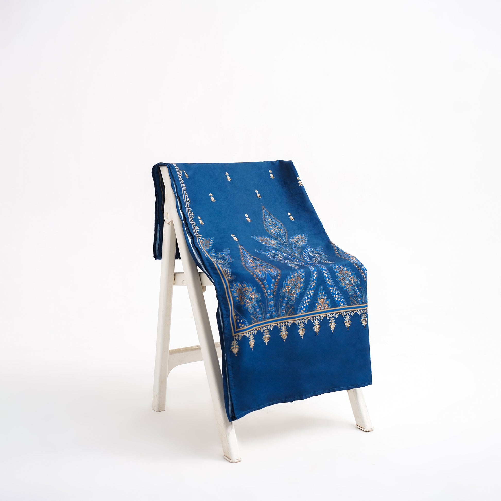 A vision of regal allure, this ensemble is crowned with a sumptuous sapphire drape adorned in intricate gold-toned motifs. Ornate paisley-inspired patterns cascade gracefully along the border, reflecting timeless craftsmanship.